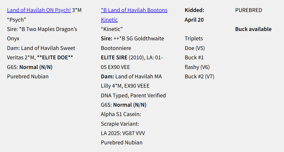 Land of Havilah ON Psych 3*M x *B Land of Havilah Bootons Kinetic. We have at least one buckling available out of this breeding. Psych is a Candyman granddaughter, and a great producer with an incredible will to milk. Psych earned her *M as a yearling in all three categories (milk, butterfat, and protein) during her 2024 lactation. She is an AR (Advanced Registry) doe and all her bucklings will have their *B designation as long as their sire is a *B or +B. Psych milked through 2025 from her first lactation with 490 DIM (days in milk) 2824# milk, 121# butterfat, 125# protein.